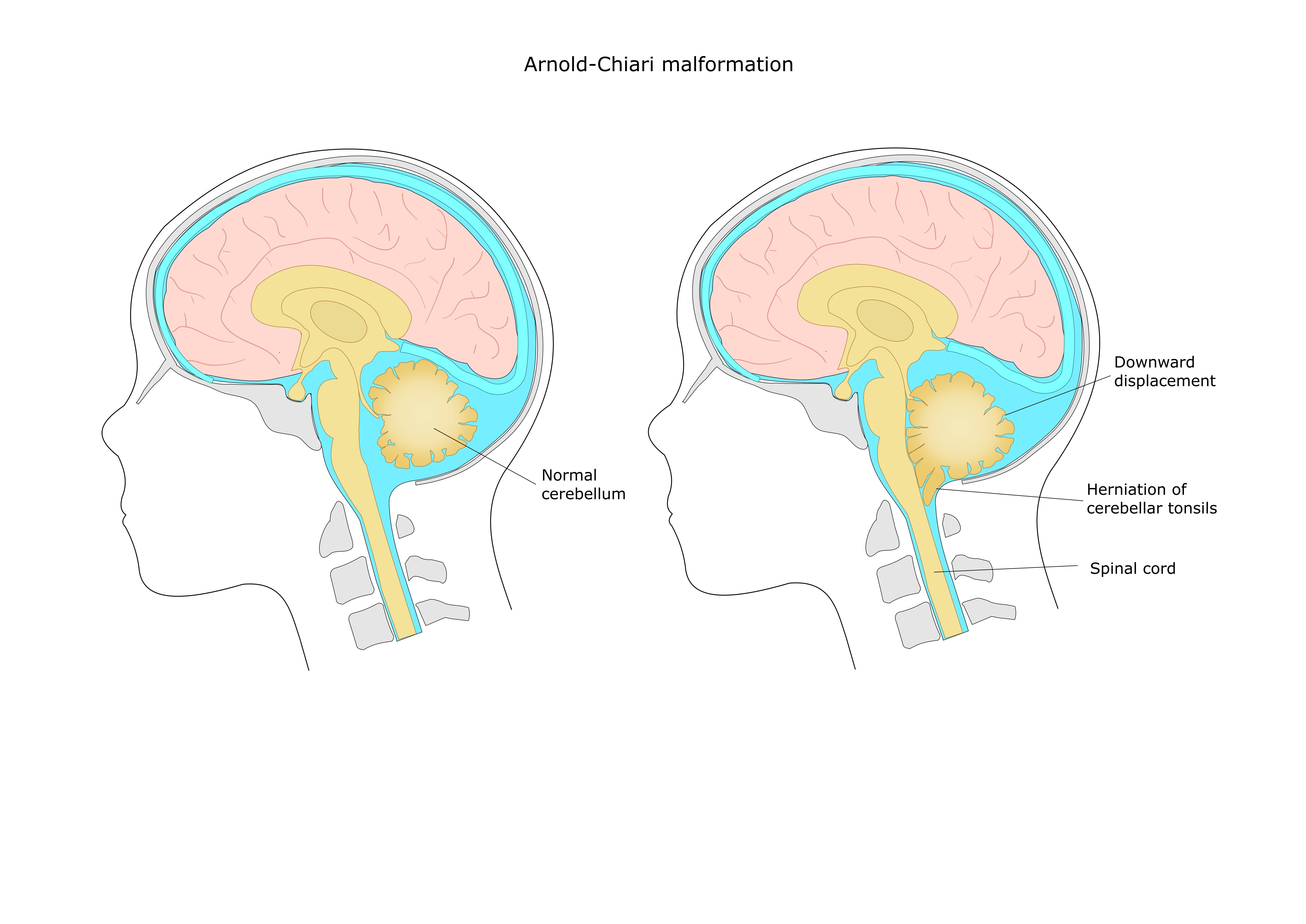 В норме рубеж между головным и спинным мозгом находится на уровне между костями черепа и шейным отделом позвоночника. Здесь располагается большое затылочное отверстие, которое, по сути, и служит условной линией. Условной, потому что ткань головного мозга переходит в спинной мозг не прерываясь, без четкой границы. Все анатомические структуры, располагающиеся выше большого затылочного отверстия, в частности, продолговатый мозг, мост и мозжечок, относятся к образованиям задней черепной ямки. Если эти образования (по одному или все вместе) спускаются ниже плоскости большого затылочного отверстия, то тогда и возникает аномалия Арнольда-Киари. Такое неправильное расположение мозжечка, продолговатого мозга приводит к компрессии спинного мозга в области шейного отдела позвоночника, мешает нормальной циркуляции спинномозговой жидкости. Иногда аномалия Арнольда-Киари сочетается с другими пороками развития краниовертебрального перехода, то есть места перехода черепа в позвоночник. В таких сочетанных случаях симптоматика обычно выражена сильнее и дает о себе знать довольно рано.