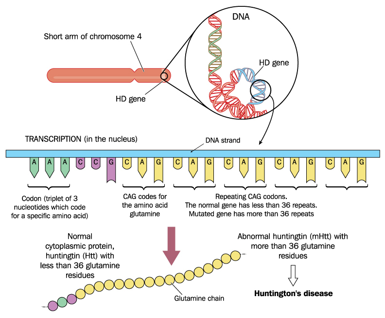 Короткое плечо 4-й хромосомы человека отвечает за синтез белка гентингтина, в состав которого входит аминокислота глутамин. В норме этот участок содержит определенное количество повторов последовательности тринуклеотидов цитозин-аденин-гуанин (ЦАГ) – генную запись, отвечающую за аминокислоту глутамин. При мутации гена происходит увеличение числа повторов ЦАГ, что приводит к удлинению цепочки аминокислот и нарушению структуры белка гентингтина. «Неправильный» белок, встраиваясь в обмен веществ, приводит к гибели нервных клеток, расположенных в головном мозге. И возникают симптомы, характерные для болезни Гентингтона.